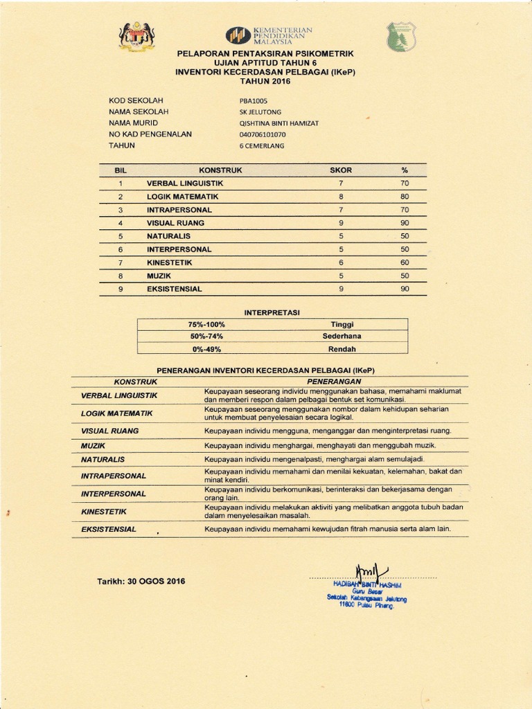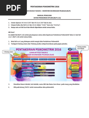 Pentafsiran skor gbk mentaksir skor dan menyediakan profil kelas dan individu pengesahan pihak pentadbir gbk mendapatkan pengesahan/tandatangan daripada guru besar profil individu. Psikometrik tahun 6 2016 (inventori kecerdasan pelbagai) ikep. Taklimat psikometrik untuk guru, ibubapa dan murid tahun 6. Rujukan psikometrik psee spa 2021. Tahniah kepada anda yang dipanggil menghadiri ujian psikometrik pada.