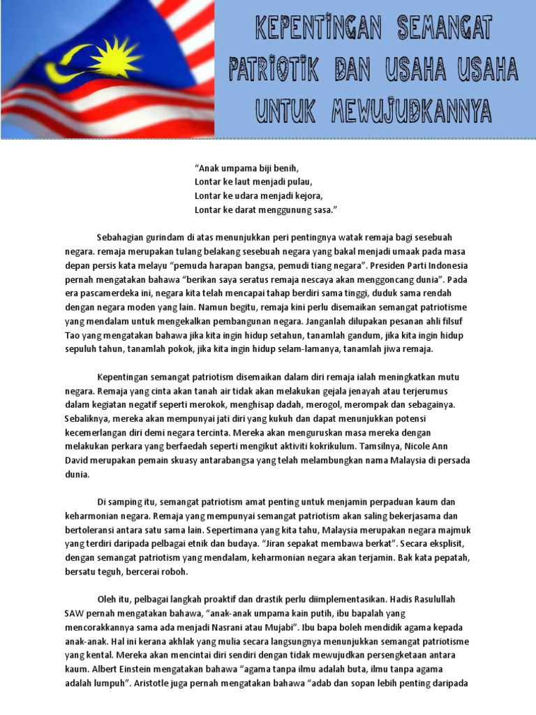 Kesavarthinee chandran 5 months ago. Jiran memberi kesan baik atau buruk kepada kita dan keluarga. Bila dilihat secara terperinci, sebenarnya terdapat banyak cara yang boleh dijalankan bagi memupuk semangat patriotik dalam kalangan masyarakat. Mengekalkan perpaduan adalah tanggungjawab semua rakyat. Sebenarnya terdapat banyak cara yang boleh dijalankan untuk meningkatkan semangat patriotik dalam kalangan masyarakat di negara kita. Zaman modenisasi kini , kita menyaksikan keruntuhan akhlak dan amalan nilai murni yang negatif dalam kalangan masyarakat berlaku secara berleluasa. Cara cara memupuk semangat patriotisma mp3 & mp4. Contextual translation of cara cara menunjukkan semangat patriotik into english. Antranya ialah memupuk semangat patriotik sejak dari bangku sekolah lagi. Pendidikan di sekolah.contohnya diterapkan dalam subjek sejarah,sering mengadakan pelbagai pertandingan sempena kemerdekaan. Tegasnya semua pihak perlu prihatin akan isu yang. Kerajaan memupuk patriotisme rasmi yang penuh isi simbolik dan istiadatnya. Satu daripada caranya adalah denganmemberikan penekanan tentang proses pemupukan semangat patriotik dari bangku sekolah lagi.